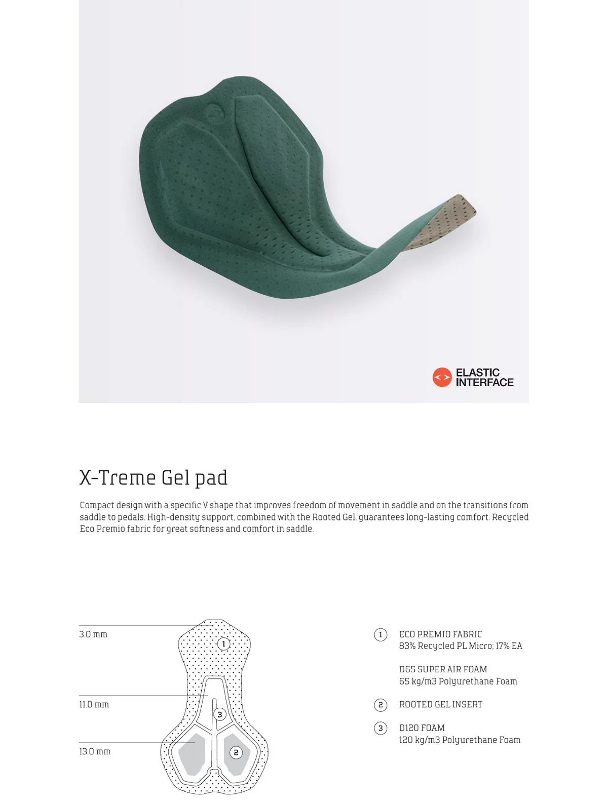 - X-Treme Gel Pad with Rooted Gel – zaawansowana wkładka kolarska o kompaktowej konstrukcji i kształcie w literę V zapewnia naturalne dopasowanie do pozycji w siodle. Wysokiej gęstości pianki oraz wkładki Rooted Gel gwarantują skuteczną amortyzację i komfort nawet podczas wielogodzinnej jazdy.